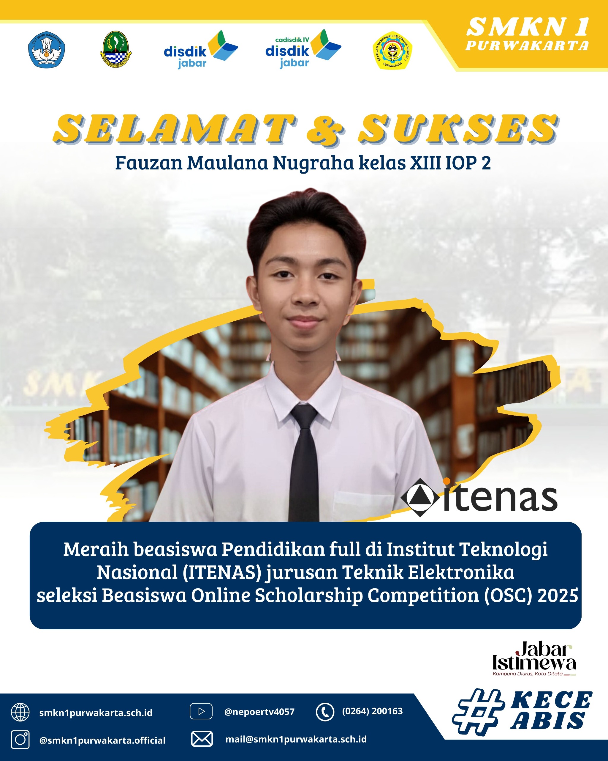 Fauzan dinyatakan lolos dan berhak mendapatkan Beasiswa Pendidikan Full (S1) di Institut Teknologi Nasional (ITENAS) pada jurusan Teknik Elektronika. Prestasi ini diraih setelah Fauzan berhasil menaklukkan serangkaian tahapan seleksi ketat dalam Online Scholarship Competition (OSC) 2025.